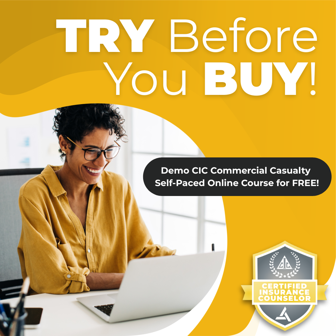 Want a preview before committing? The CIC Commercial Casualty Self-Paced demo gives you a free look inside Section 3 of the course, featuring select lessons on the