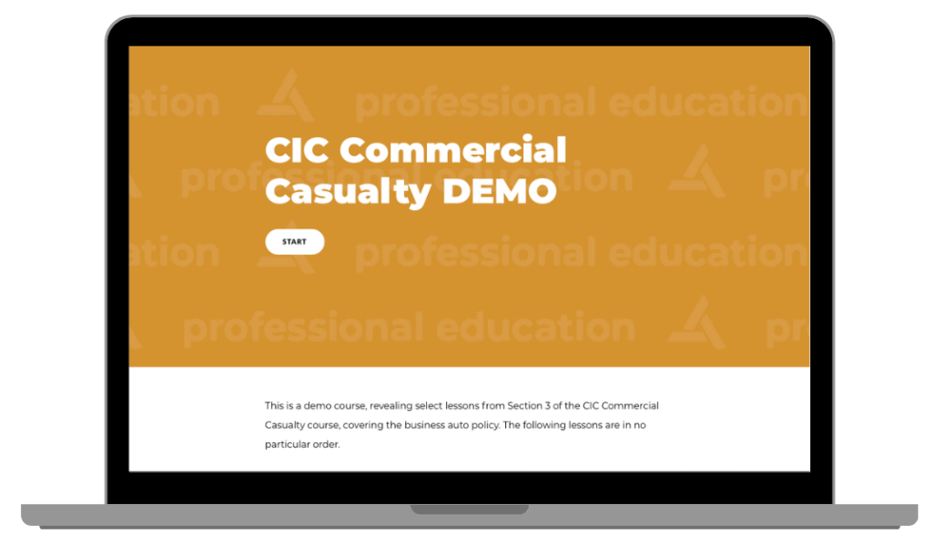 The CIC Commercial Casualty Self-Paced demo gives you a free look inside Section 3 of the course, featuring select lessons on the Business Auto Policy—presented in no particular order.
